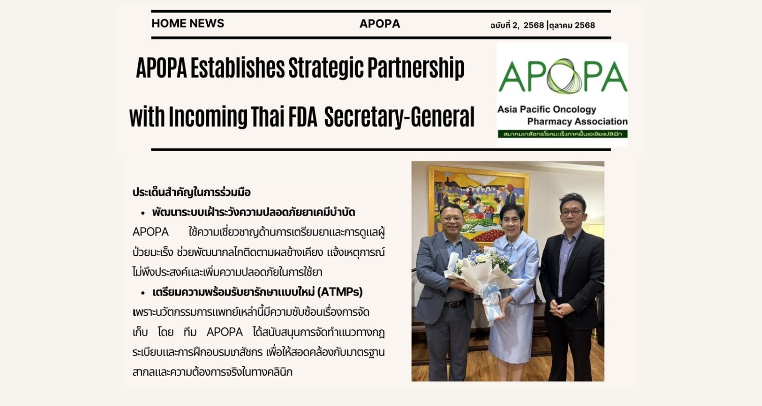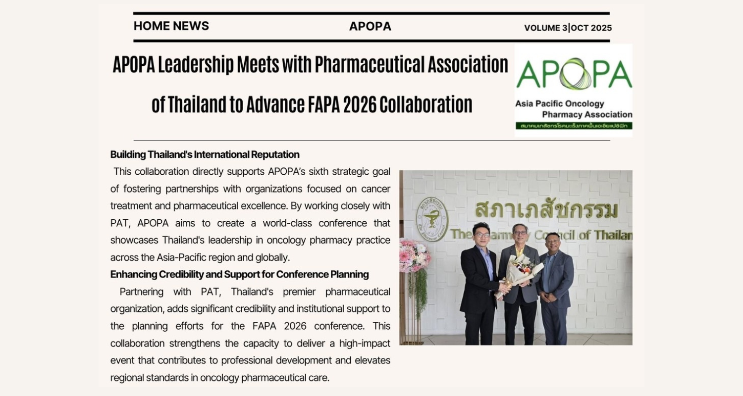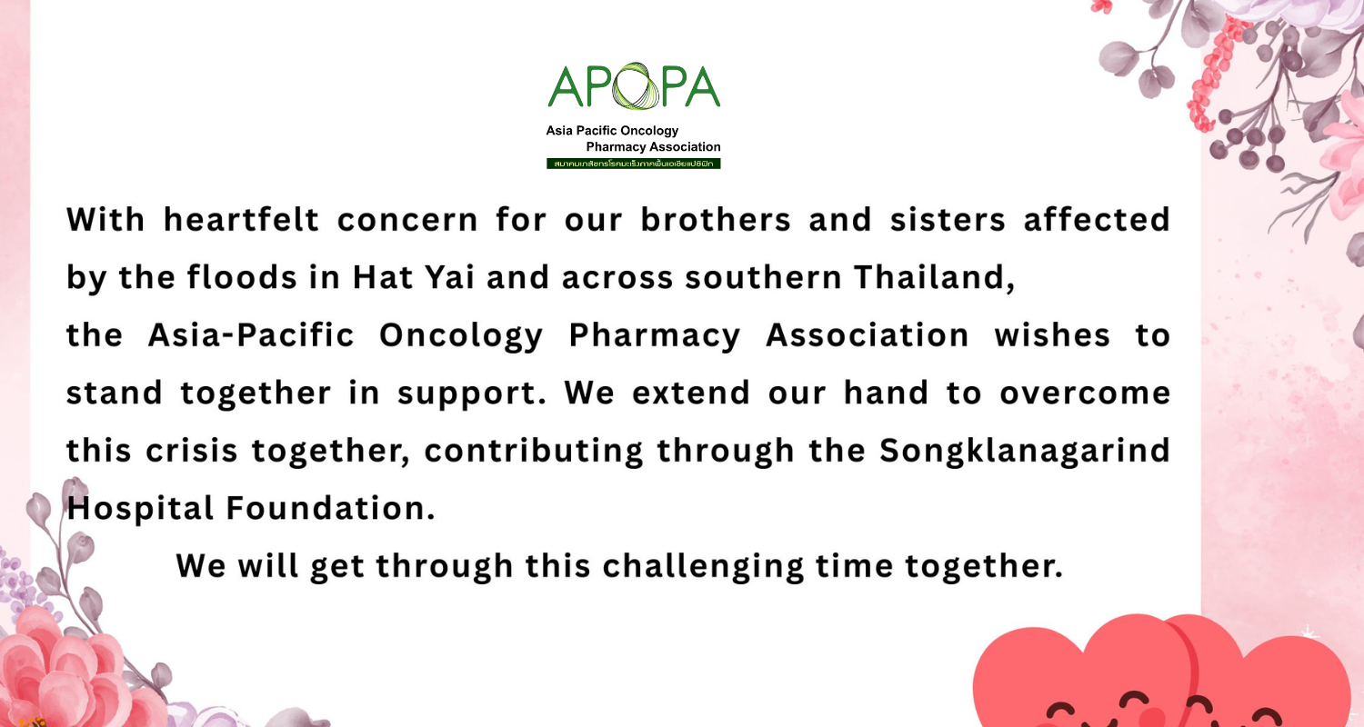 To foster collaboration with national and international cancer care organizations such as the Thai Society of Clinical Oncology (TSCO), the American Society of Clinical Oncology (ASCO) and the International Society of Oncology Pharmacy Practitioners (ISOPP) aiming to promote and develop oncology pharmacy practice standards in Thailand and support policy-level initiatives to ensure the appropriate use of cancer medications.
